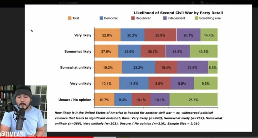 Around 60% of Americans think civil war is somewhat likely or very likely. This is a lot and to some, including Tim Pool, pictured above, it is scary.